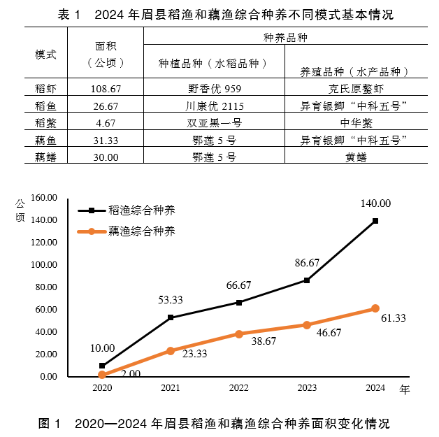 2020年以来,眉县积极争取并先后获得省级财政资金300万元支持稻渔和藕渔产业的发展,通过制定方案和标准,开展技术培训、试验示范和现场交流等方式深入开展指导服务,先后创建稻渔和藕渔综合种养示范基地7个,基本形成了以槐芽镇为中心,以常兴、齐镇为副中心的稻渔和藕渔综合种养发展布局,全县稻渔综合种养面积达201.34公顷。2024年眉县稻渔综合种养不同模式基本情况如表1所述,全县的稻渔和藕渔综合种养产业由最初的槐芽镇东柿林村废弃稻田发展稻渔综合种养,到现在的五个镇(街)相继建设,呈现出“规模化发展、多元化种养、标准化经营、链条式发展”的良好态势。从图1可以看到,截止2024年底,眉县共计发展稻渔和藕渔综合种养面积201.34公顷,产业发展迅速。其中,稻渔综合种养面积从2020年的10.00公顷增长到2024年140.00公顷,藕渔综合种养面积从2020年的2.00公顷增长到2024年61.33公顷。目前,眉县种养规模3.3公顷以上的经营主体10个,33.3公顷以上6个,333.3公顷亩以上1个。