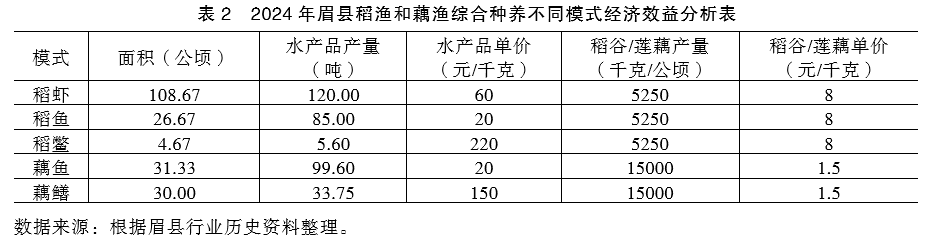 稻虾综合种养模式是眉县发展面积最大的稻渔综合种养模式,面积达108.67公顷,主要养殖的是克氏原螯虾,种植的水稻品种是“野香优959”,主要分布在眉县槐芽镇、齐镇。2024年水产品产量为120.00吨,水产品单价为60元/千克。稻鱼综合种养模式面积达26.67公顷,主要养殖的是异育银鲫“中科五号”,种植的水稻品种是川康优2115,主要分布在槐芽镇、齐镇。2024年水产品产量为85.00吨,水产品单价为20元/千克。稻鳖综合种养模式面积为4.67公顷,主要养殖的是中华鳖,种植的水稻品种是双亚黑一号,主要分布在槐芽镇、齐镇。2024年水产品产量为5.60吨,水产品单价为220元/千克。藕鱼综合种养模式面积为31.33公顷,24年主要养殖的异育银鲫“中科五号”产量为99.60吨,单价为20元/千克。藕鳝综合种养主要以蚯蚓、蝇蛆、螺蛳肉、小杂鱼为饵料,2024年黄鳝的产量约为33.75吨,按市场价格每千克150元计算,总收入可达5062.50万元。