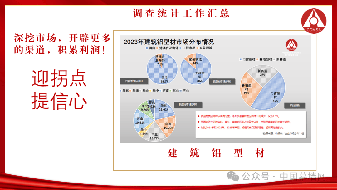 2023年的铝型材市场喜忧参半,国内市场较为低迷,但国外市场实现了新突破。铝型材行业需要加快拓展国内外市场的双向互补,2023年我国铝型材行业出现了新情况、新变化和新挑战。一是消费面临拐点,即将由增量市场变为存量市场;二是产能仍然持续增长,过剩程度进一步加剧;三是受房地产行业“暴雷”影响,新型应用开发不同程度受到阻碍;四是新增贸易摩擦案件仍时有发生,出口压力持续加大,出口数量徘徊不前;五是安全生产事故仍有发生。