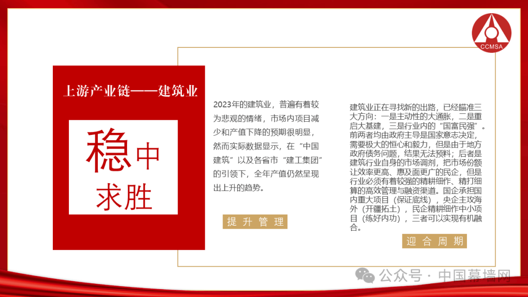 门窗幕墙行业正面临“新常态”,首重“穿越周期”,更重坚持创新。经历过低于预期的保守,2023年的门窗幕墙行业企业实际正在以“坚持与热爱”为基调,逆势上扬的过程,TOP企业加大新布局与新投入,中小企业强化内部管理与市场调整,面对门窗幕墙行业的需求离散化的“新常态”,“新”与“稳”成为了行业的最新趋势,用“创新”来寻求“稳定”的生存与发展空间,我们提到的创新不再是单纯的技术与工艺改进,也包括了对市场内的渠道搭建、企业文化建设及经营行为的管理。